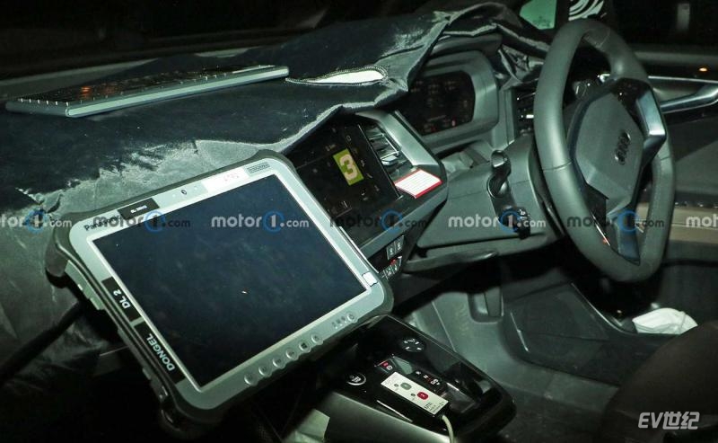 液晶仪表采用了全液晶设计,中控大屏悬浮在中控台上,大屏一侧设计了空调出风口。预计将搭载奥迪最新MMI操作系统。方向盘采用了四辅设计,并且采用了平顶和平底设计,比较有新鲜感。转向柱上我们可以看到两个拨杆,下方拨杆预计作为操作车辆智能辅助驾驶功能。